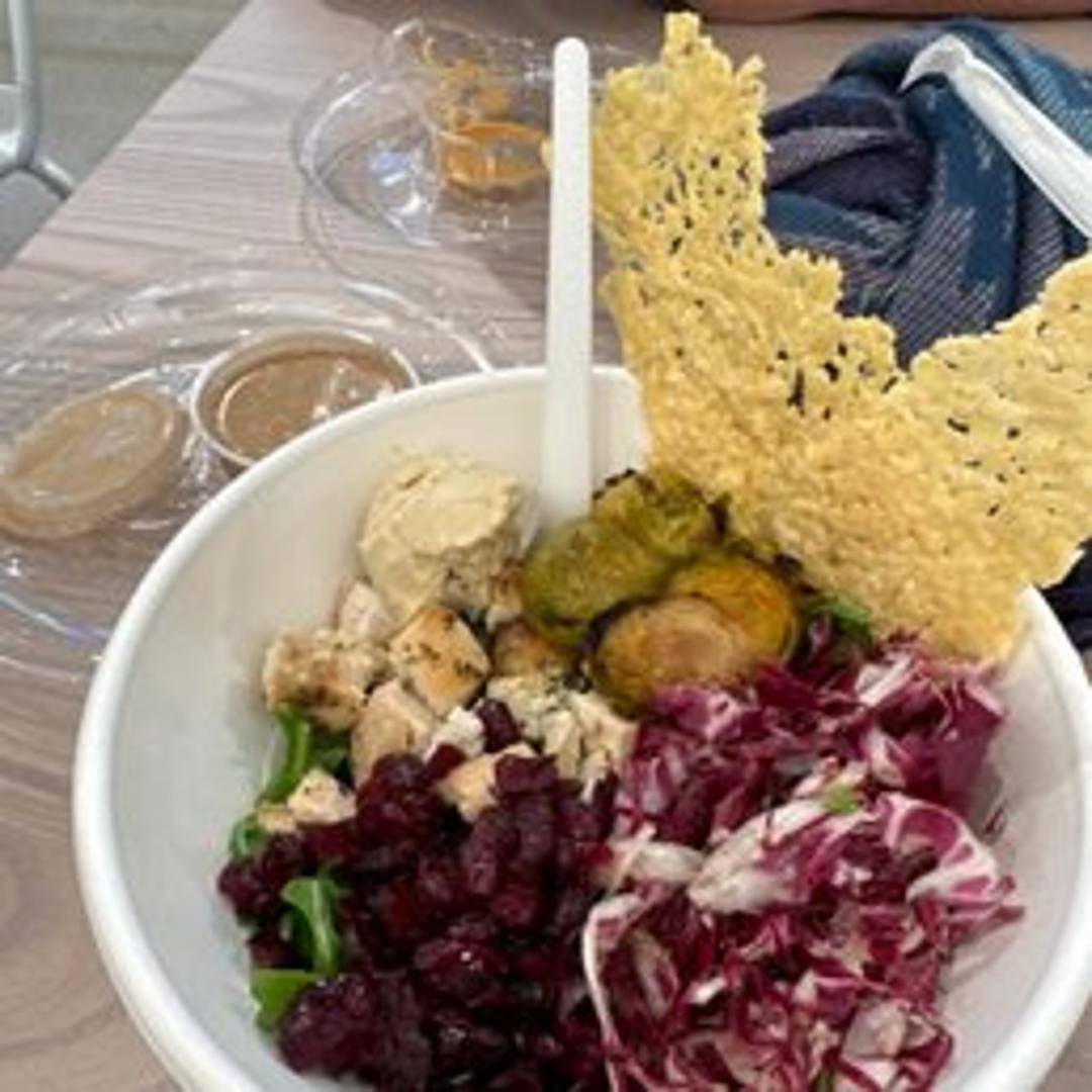 A nutrient-rich bowl with spinach, quinoa, roasted sweet potatoes, toasted pumpkin seeds, dried cranberries, goat cheese, and a maple Dijon vinaigrette. A sweet and savory blend perfect for a wholesome meal.
