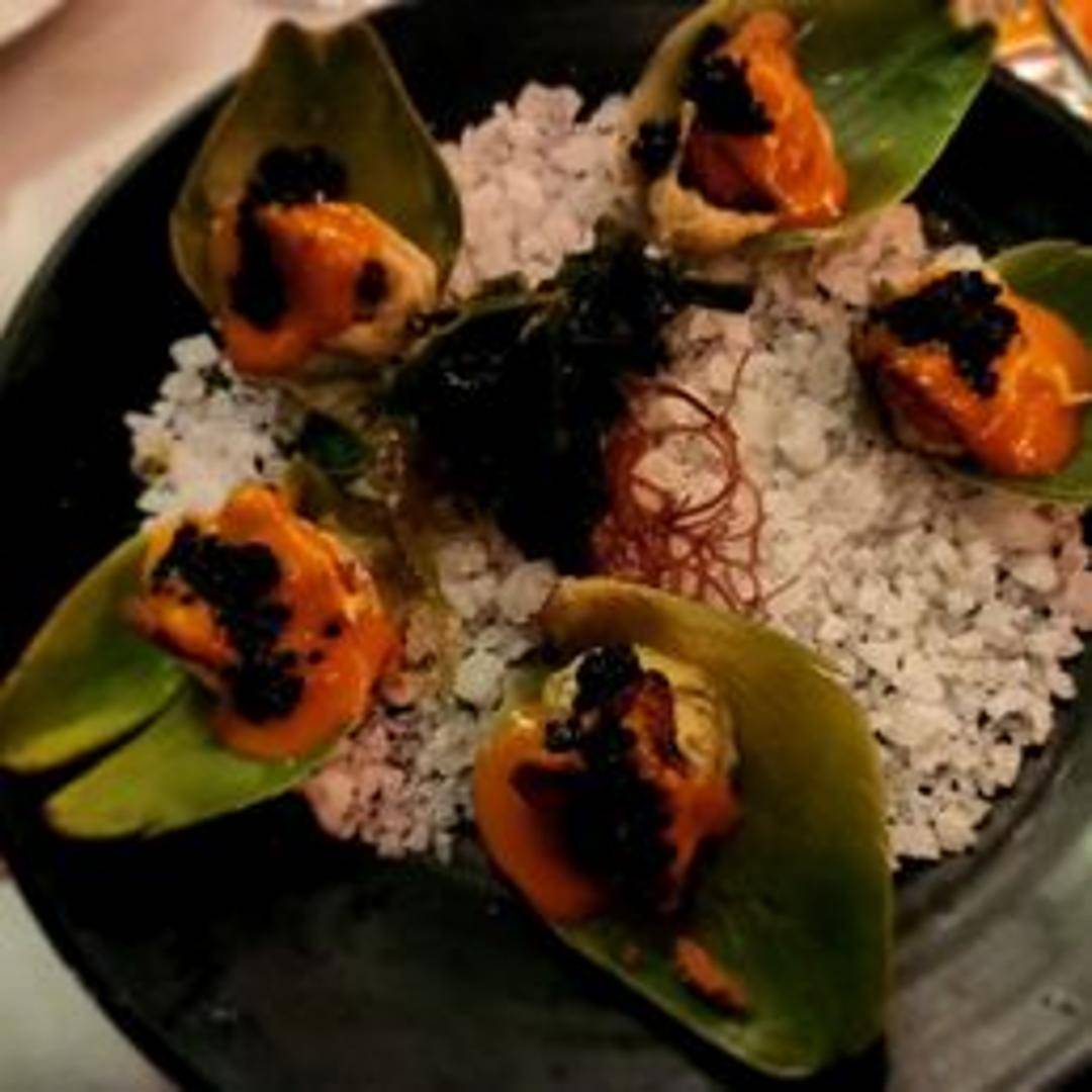 A creative dish featuring artichoke hearts prepared and presented to resemble oysters. Often served with a creamy sauce and toppings reminiscent of traditional oyster preparations. This dish is a vegan interpretation of the classic oyster experience.
