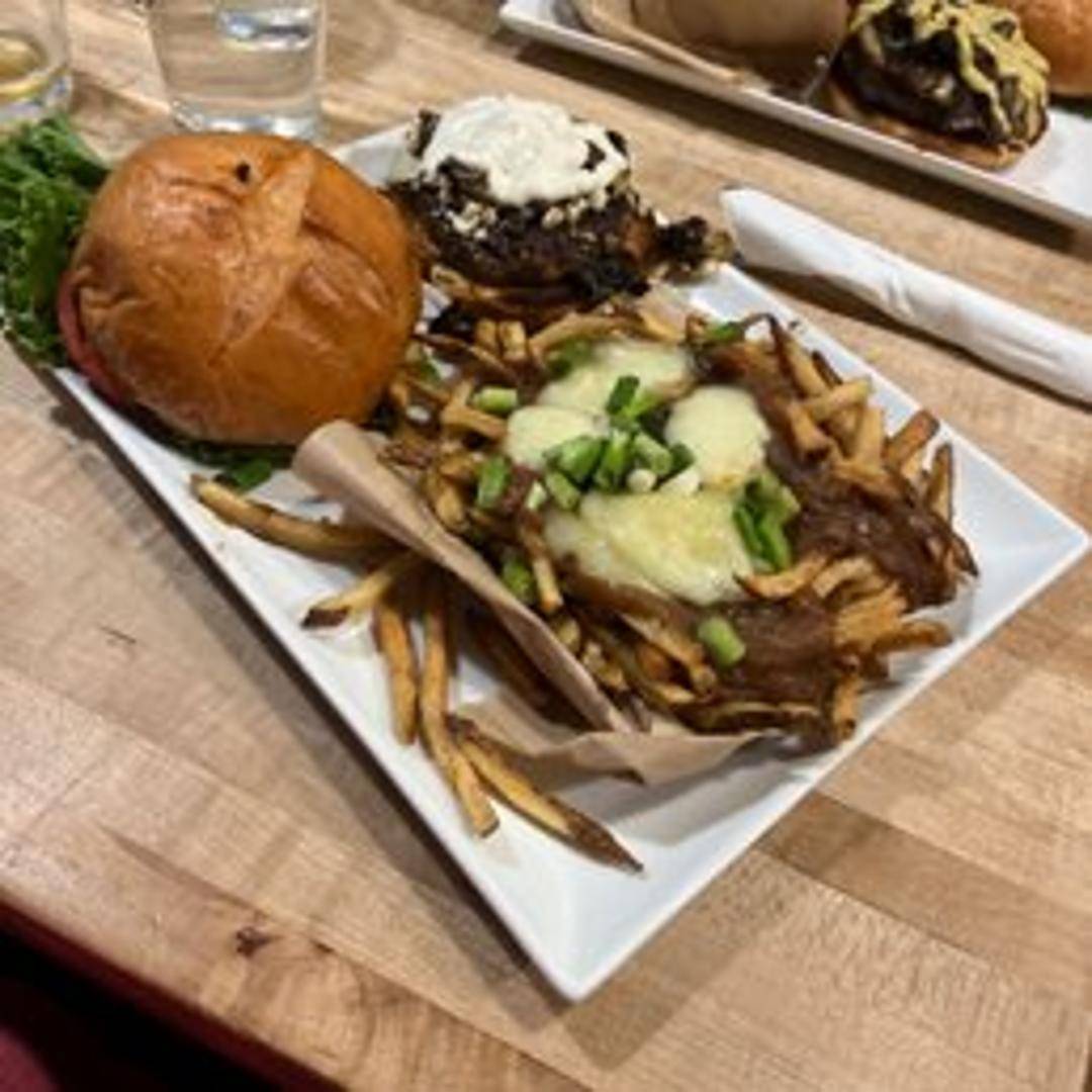 A juicy beef patty topped with Swiss cheese, sautéed mushrooms, caramelized onions, and a garlic aioli on a toasted brioche bun.