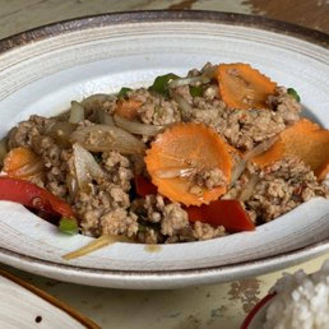 Stir-fried dish with your choice of protein (chicken, pork, beef, tofu, or shrimp), Thai basil, chili peppers, garlic, and a savory sauce, served over rice. Features a spicy and aromatic flavor.