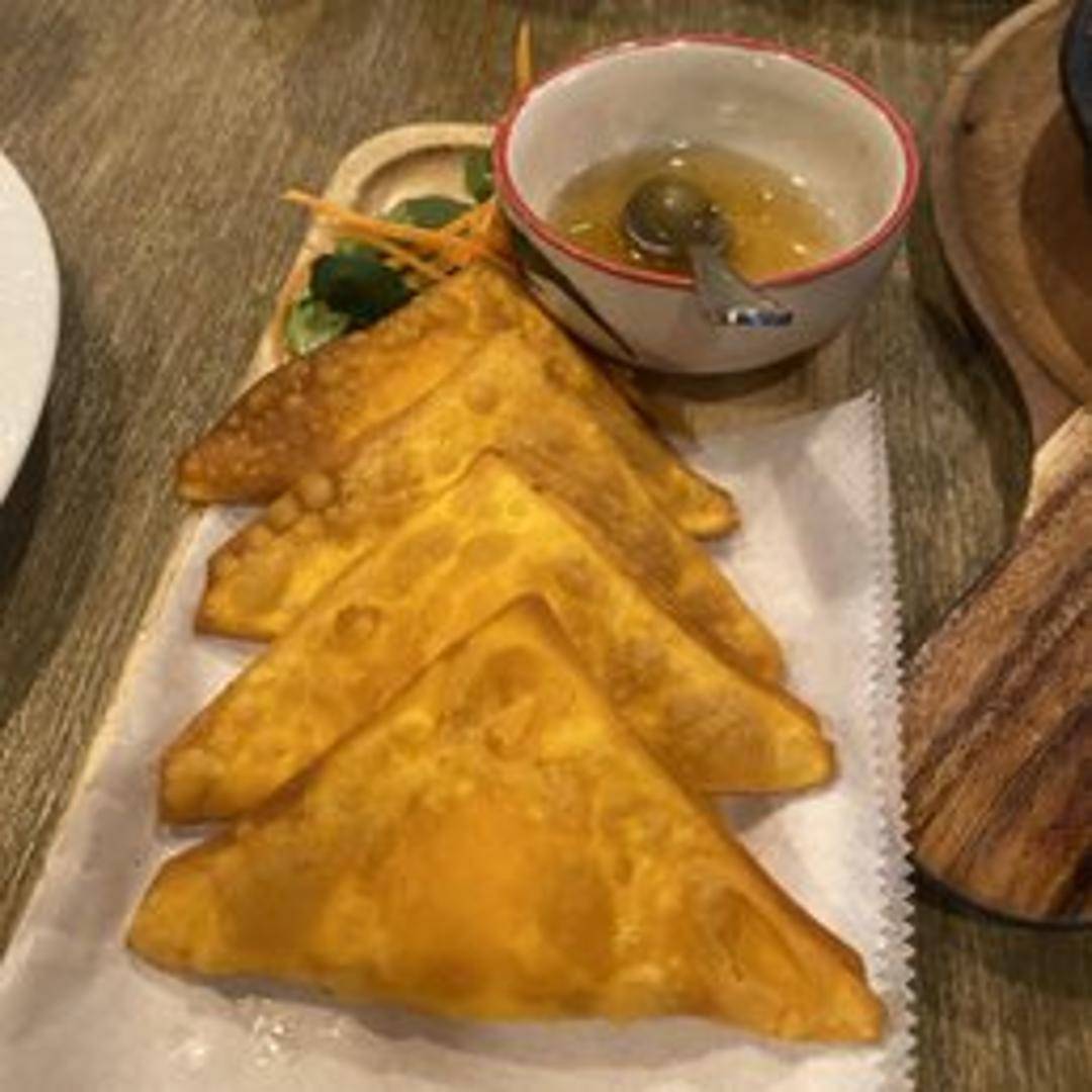 Crispy wonton dumplings filled with a creamy mixture of imitation crab meat, cream cheese, and seasonings, served with a sweet dipping sauce.