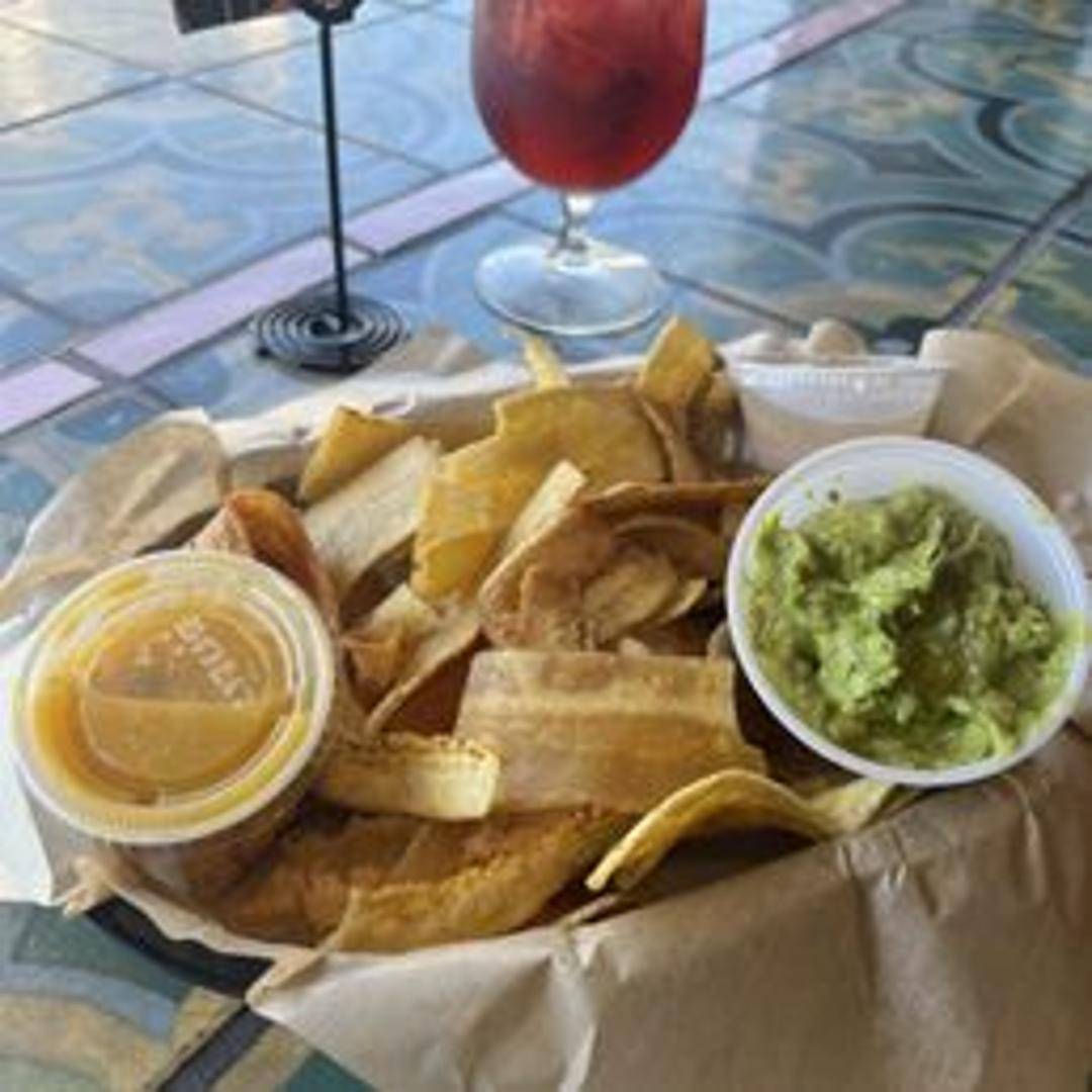 Thinly sliced green plantains that are deep-fried until crispy and golden. A salty and savory snack.