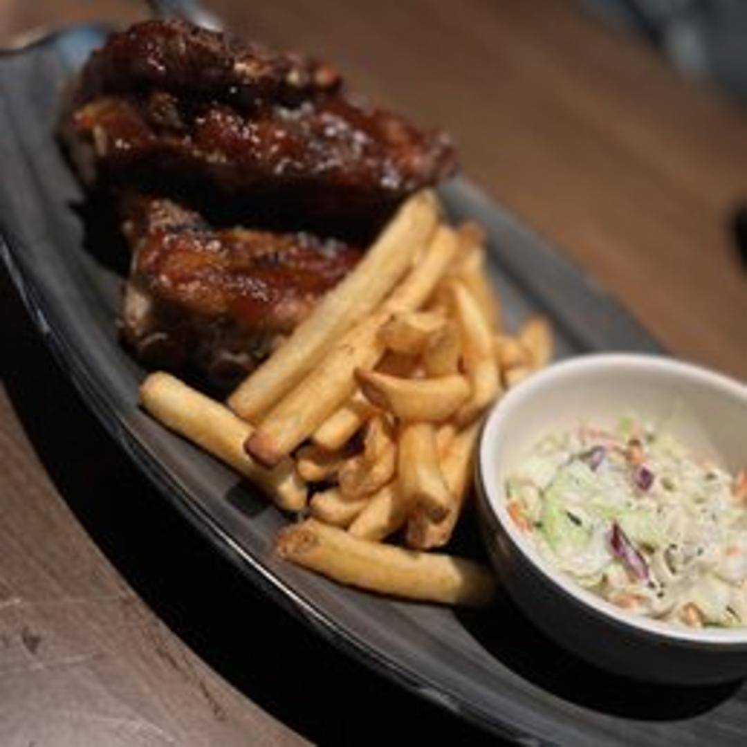 Slow-cooked pork ribs, tender and falling off the bone, glazed with a sweet and savory barbecue sauce, served with coleslaw.