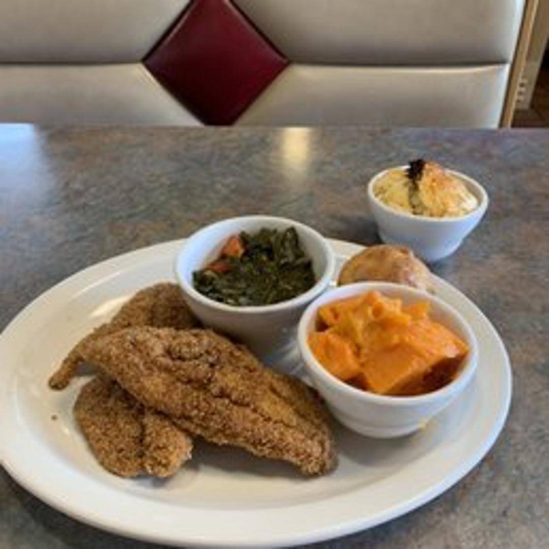 A delicious and completely plant-based take on a classic soul food dish. Features flaky, seasoned vegan 'catfish,' served with your choice of two classic sides like mac and cheese, collard greens, yams, or other daily specials. Includes cornbread.