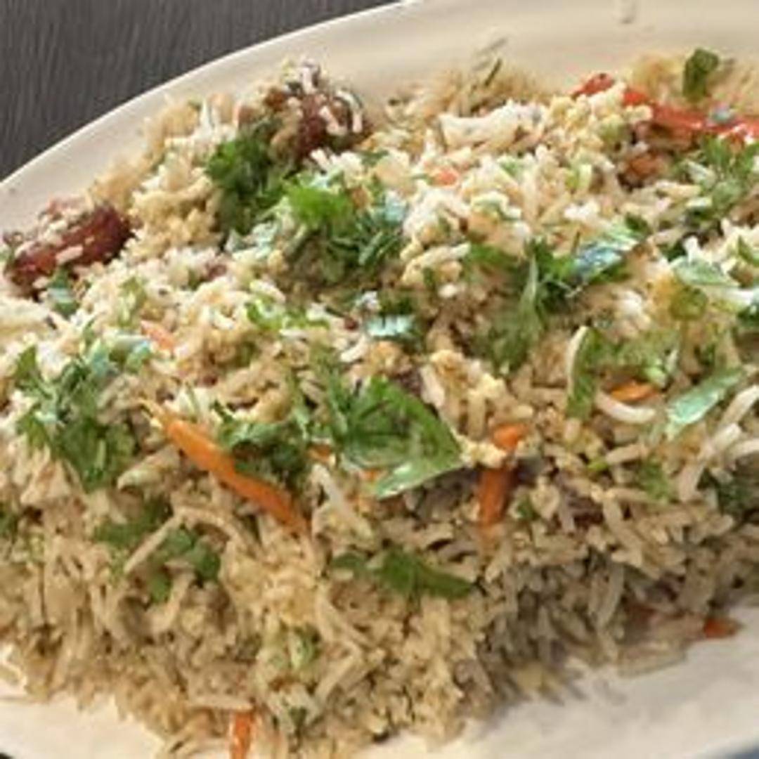 Classic fried rice dish stir-fried with tender pieces of chicken, mixed vegetables, soy sauce, and aromatic spices.
