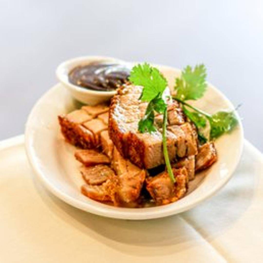 This Cantonese-style roast pork, or Char Siu, showcases tender cuts of pork, often marinated and slow-roasted to achieve a beautiful, glossy, caramelized exterior. It boasts a perfectly balanced sweet and savory flavor profile with a juicy, flavorful interior, making it a beloved dish for its rich taste and texture.