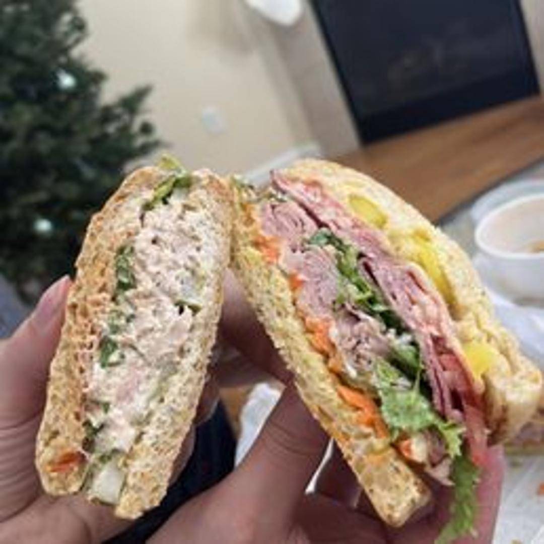 A flavorful sandwich featuring a selection of Italian deli meats like salami, pepperoni, and ham, topped with provolone cheese, lettuce, tomato, onion, banana peppers, and a tangy Italian dressing on a toasted roll.
