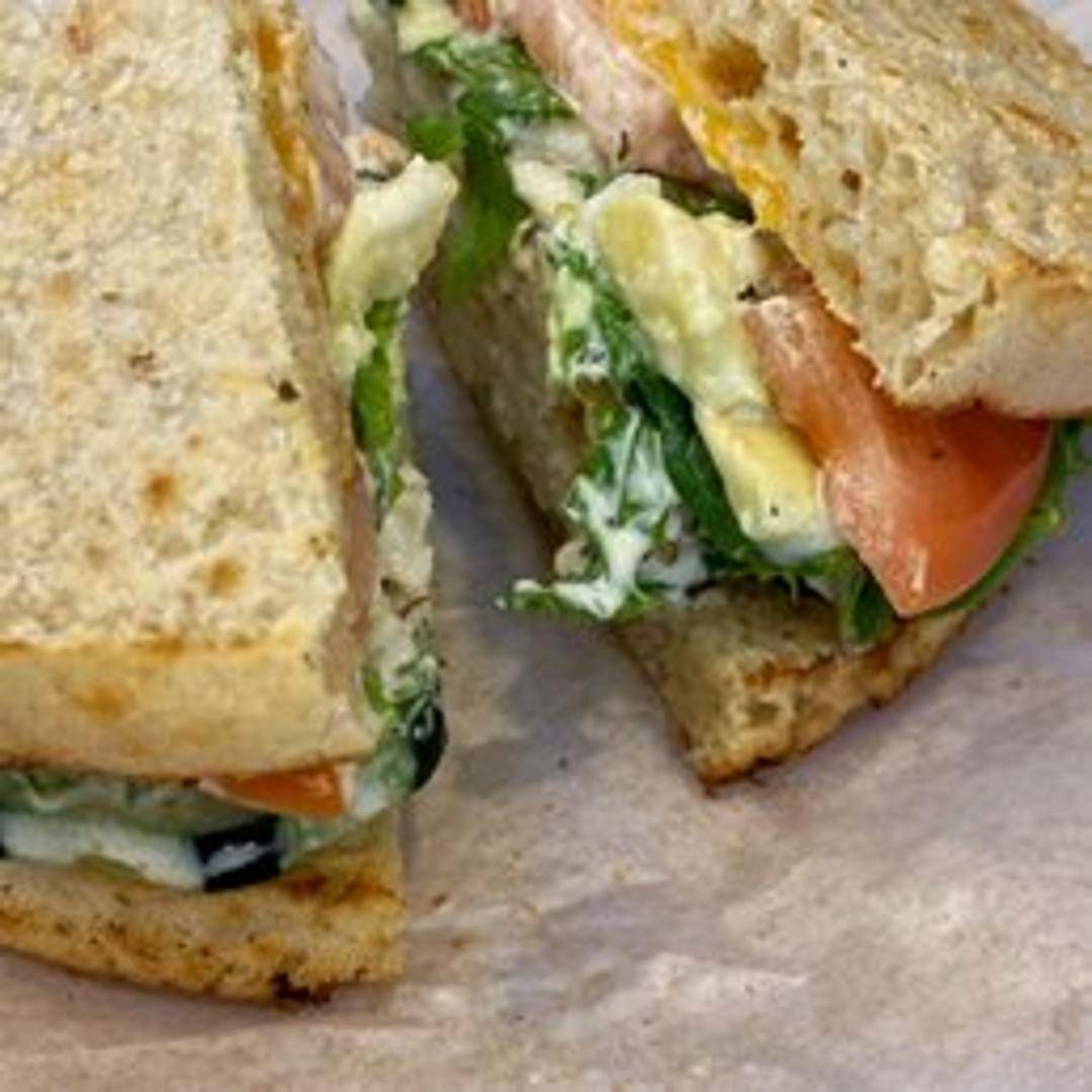 Grilled chicken breast topped with fresh avocado slices, crisp lettuce, ripe tomato, and a flavorful sauce on a toasted bun.