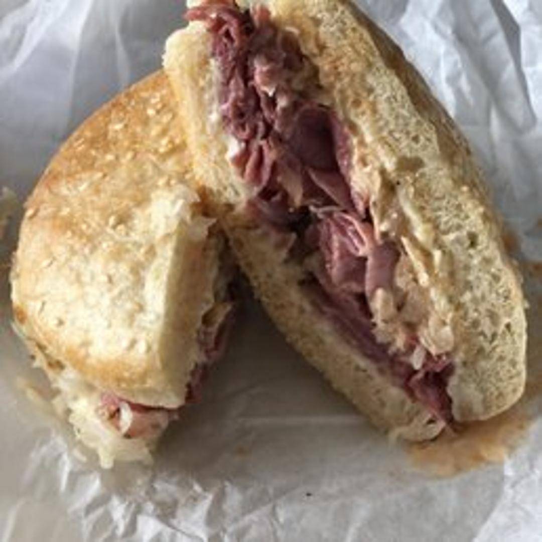 A classic Reuben featuring thinly sliced pastrami, melted Swiss cheese, tangy sauerkraut, and creamy Thousand Island dressing, all piled high on grilled rye bread.