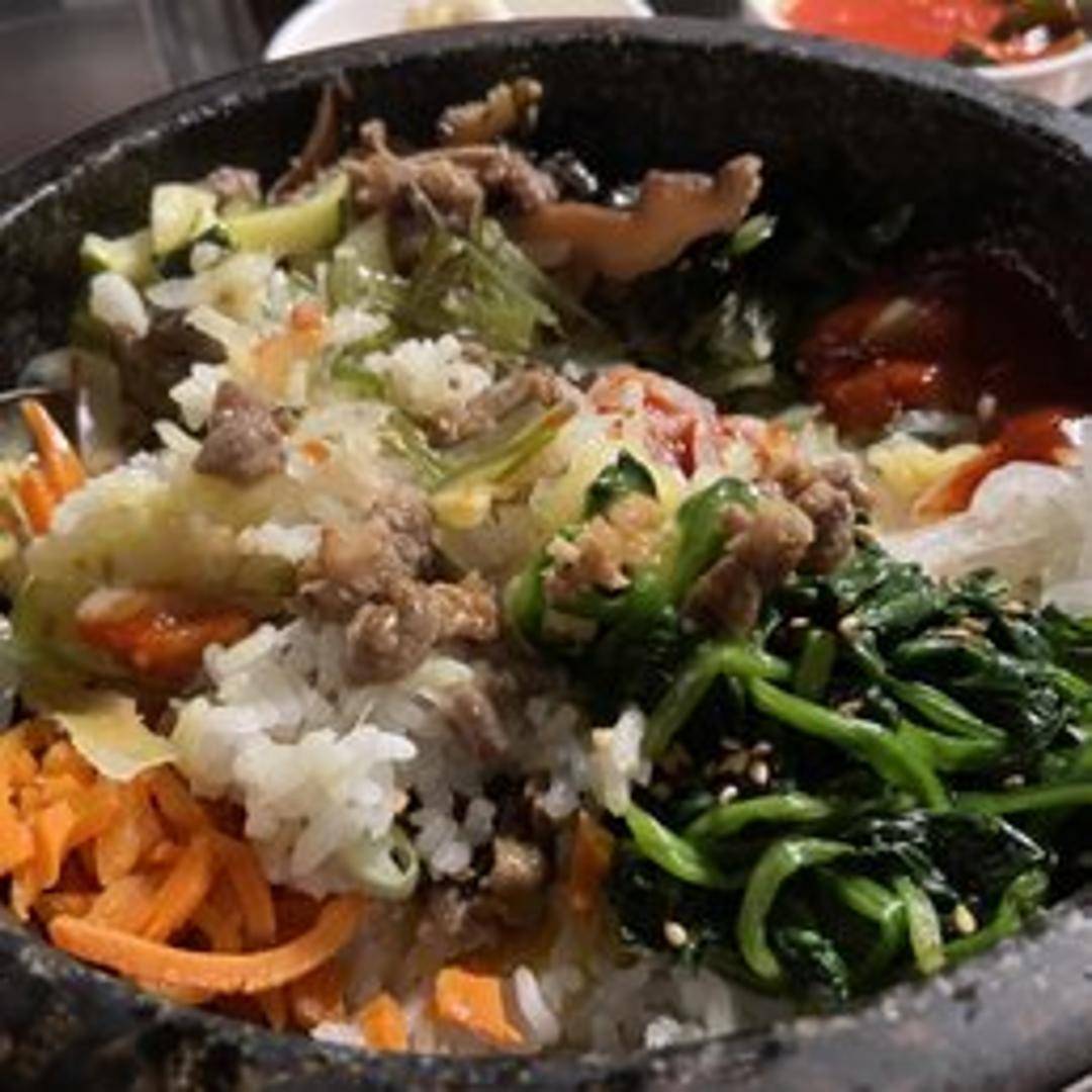 Bibimbap. A Korean rice dish topped with assorted sauteed vegetables (such as carrots, spinach, bean sprouts, and mushrooms), a fried egg, and gochujang (Korean chili paste). Typically served in a hot stone bowl for a crispy rice bottom.