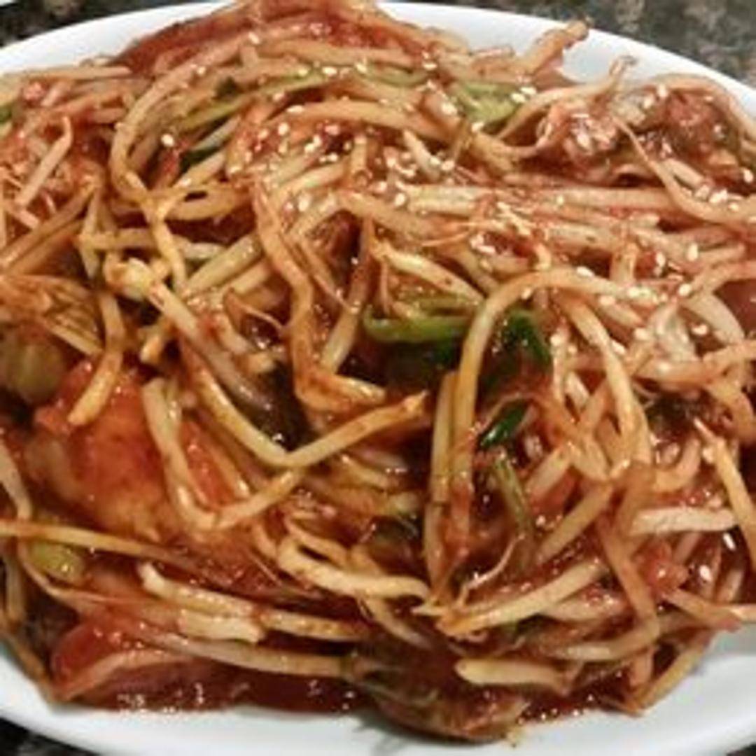 A hearty and flavorful casserole featuring tender chunks of monkfish simmered in a spicy and savory broth with vegetables such as bean sprouts, radish, and scallions. Served hot and often shared.