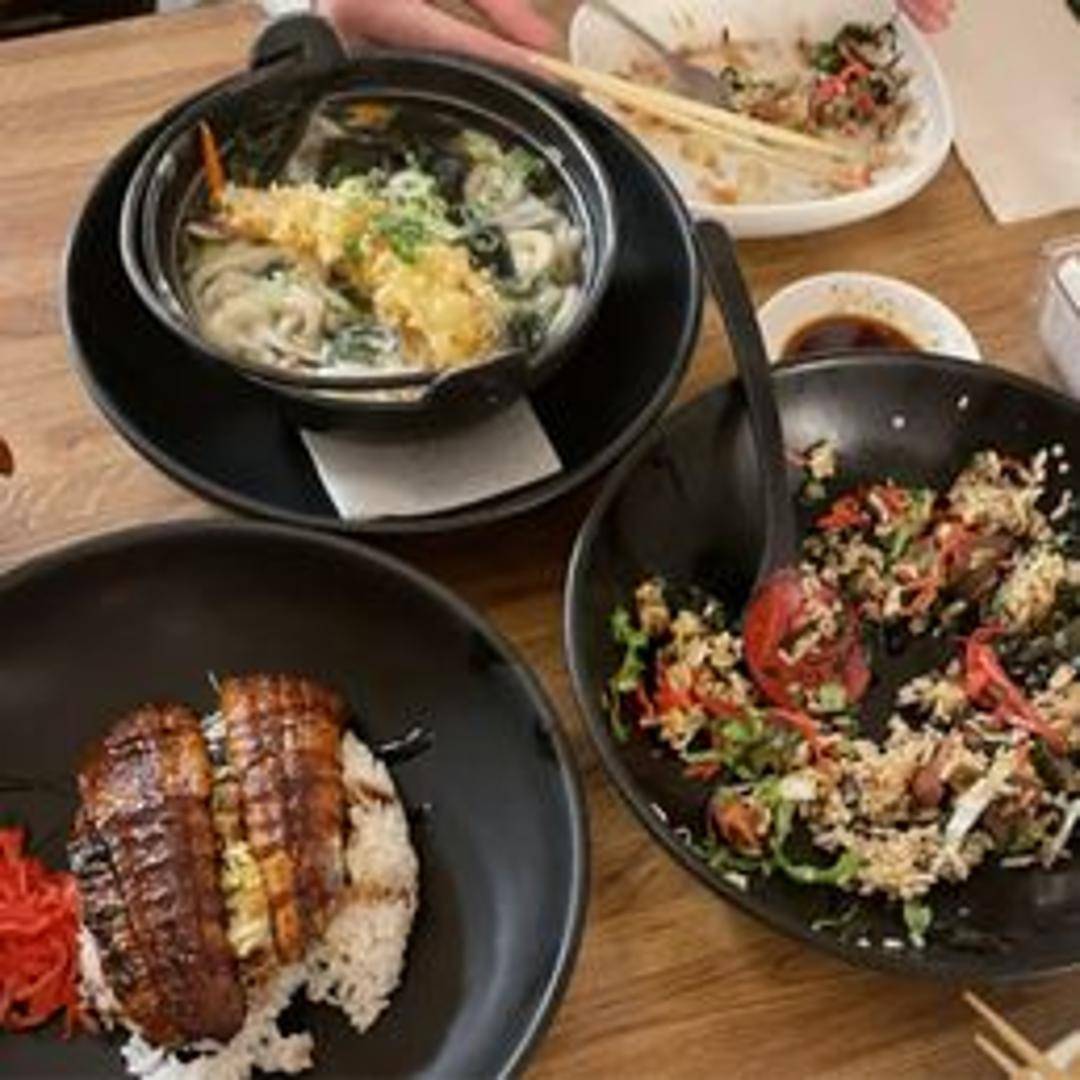Grilled eel (unagi) glazed with a sweet and savory kabayaki sauce, served over a bed of fluffy steamed rice. The eel is tender and flavorful, with a slightly crispy skin. Garnished with sansho pepper and pickled ginger.