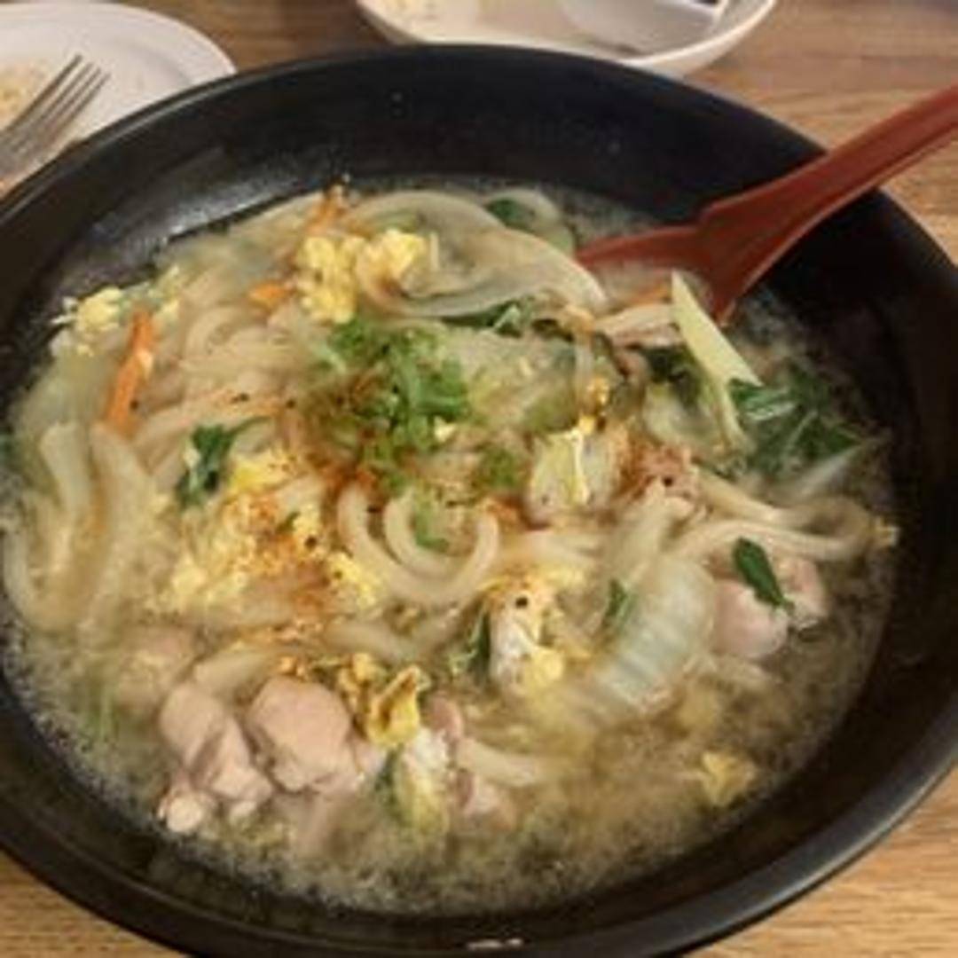A comforting bowl of thick, chewy wheat flour noodles in a flavorful broth. Typically includes toppings such as thinly sliced beef or pork, fish cake (kamaboko), green onions, tempura flakes (tenkasu), and a soft-boiled egg.