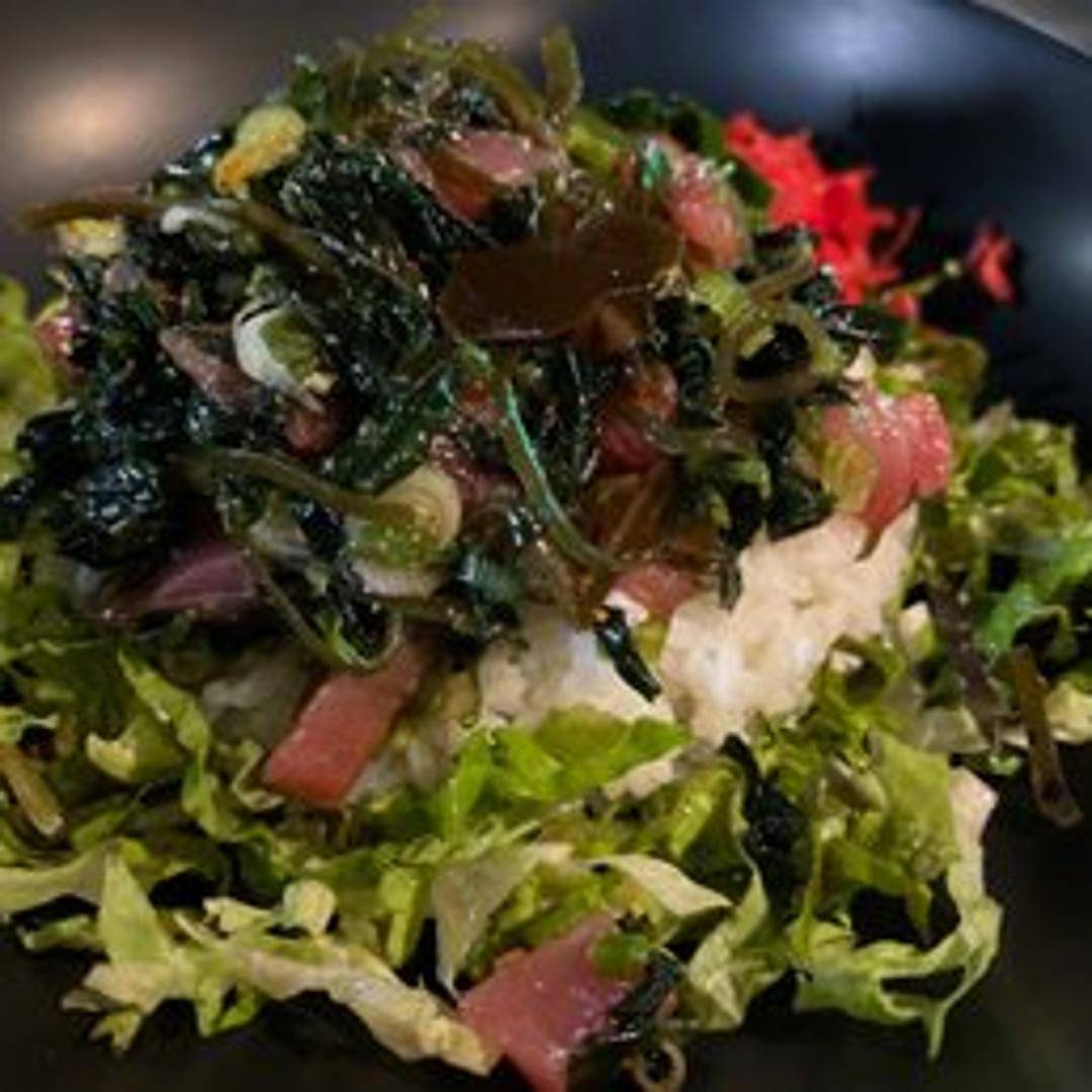 Fresh, cubed ahi tuna marinated in a flavorful poke sauce, featuring soy sauce, sesame oil, and other complementary seasonings. Served over sushi rice and accompanied by avocado, seaweed salad, edamame, green onions, and sesame seeds.