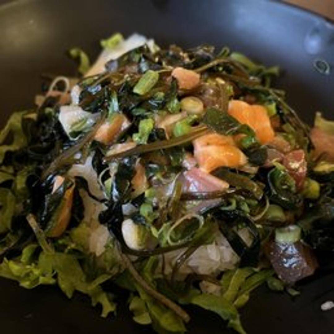 A customizable rice bowl featuring a variety of fresh, marinated raw fish (usually tuna, salmon, and/or yellowtail), avocado, seaweed salad, edamame, cucumber, sesame seeds, and a choice of poke sauce (such as spicy mayo, sesame oil, or soy sauce). Served over a bed of seasoned sushi rice.