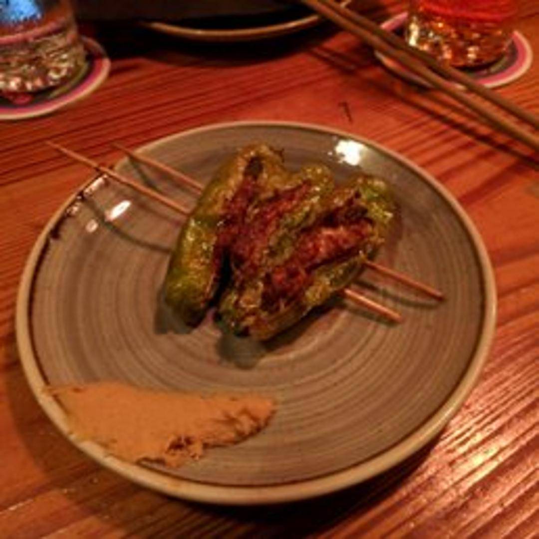Mild and subtly sweet shishito peppers, expertly prepared and filled with a savory stuffing. The peppers are often blistered or lightly fried to bring out their natural flavor and a slight char, then generously filled with a flavorful mixture which might include seasoned ground meat, a delicate seafood paste, or a savory vegetable blend, offering a delightful bite-sized appetizer.