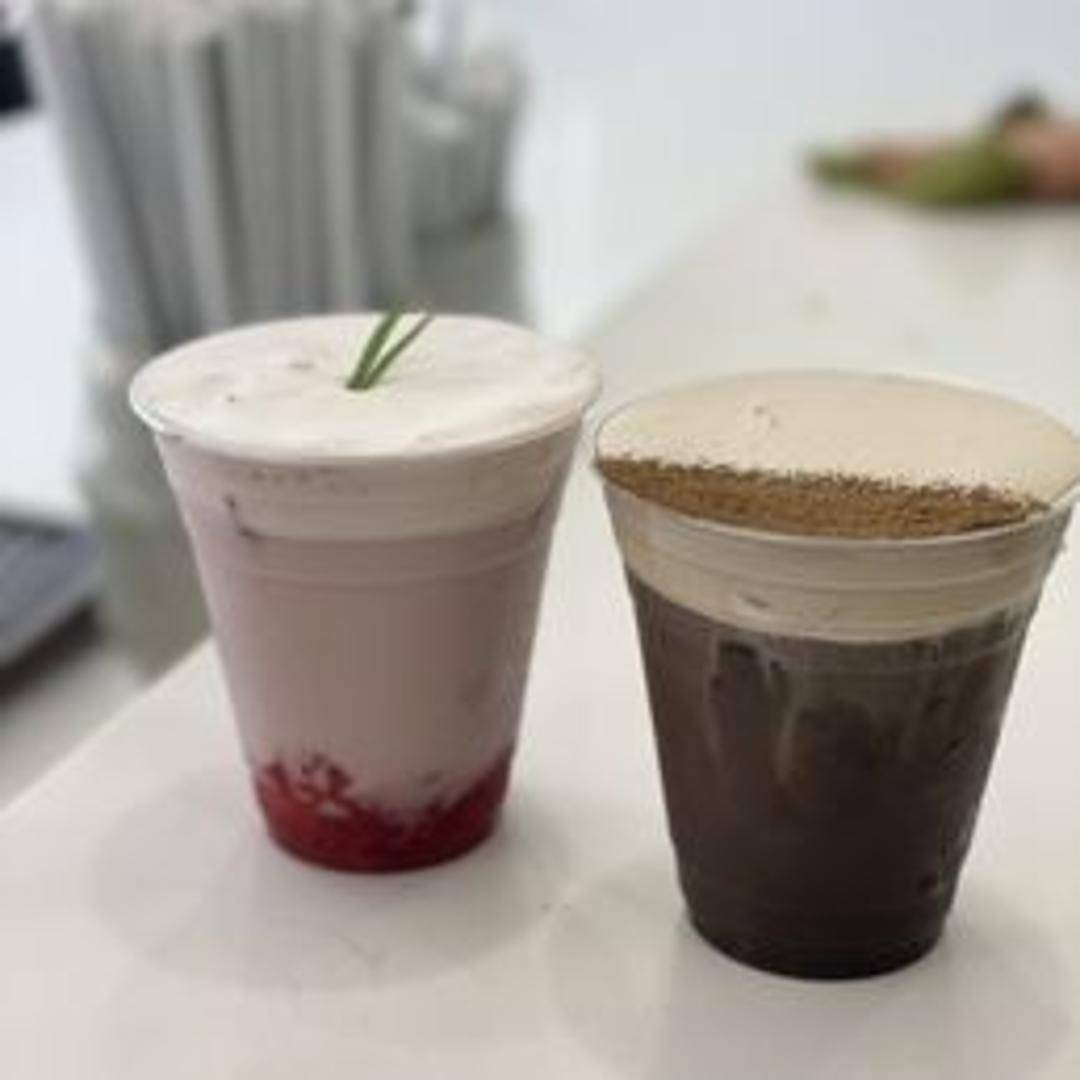 A layered coffee beverage featuring rich espresso topped with a generous layer of freshly whipped cream infused with the sweet and tangy flavor of strawberries. Enjoy the contrasting textures and flavors as the creamy strawberry topping gradually blends with the robust coffee beneath.