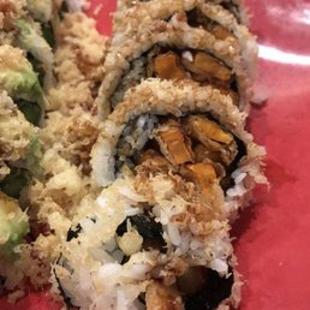 A vegetarian sushi roll filled with lightly battered and fried sweet yam tempura. Rolled with sushi rice and seaweed, often served with a sweet or tempura dipping sauce.