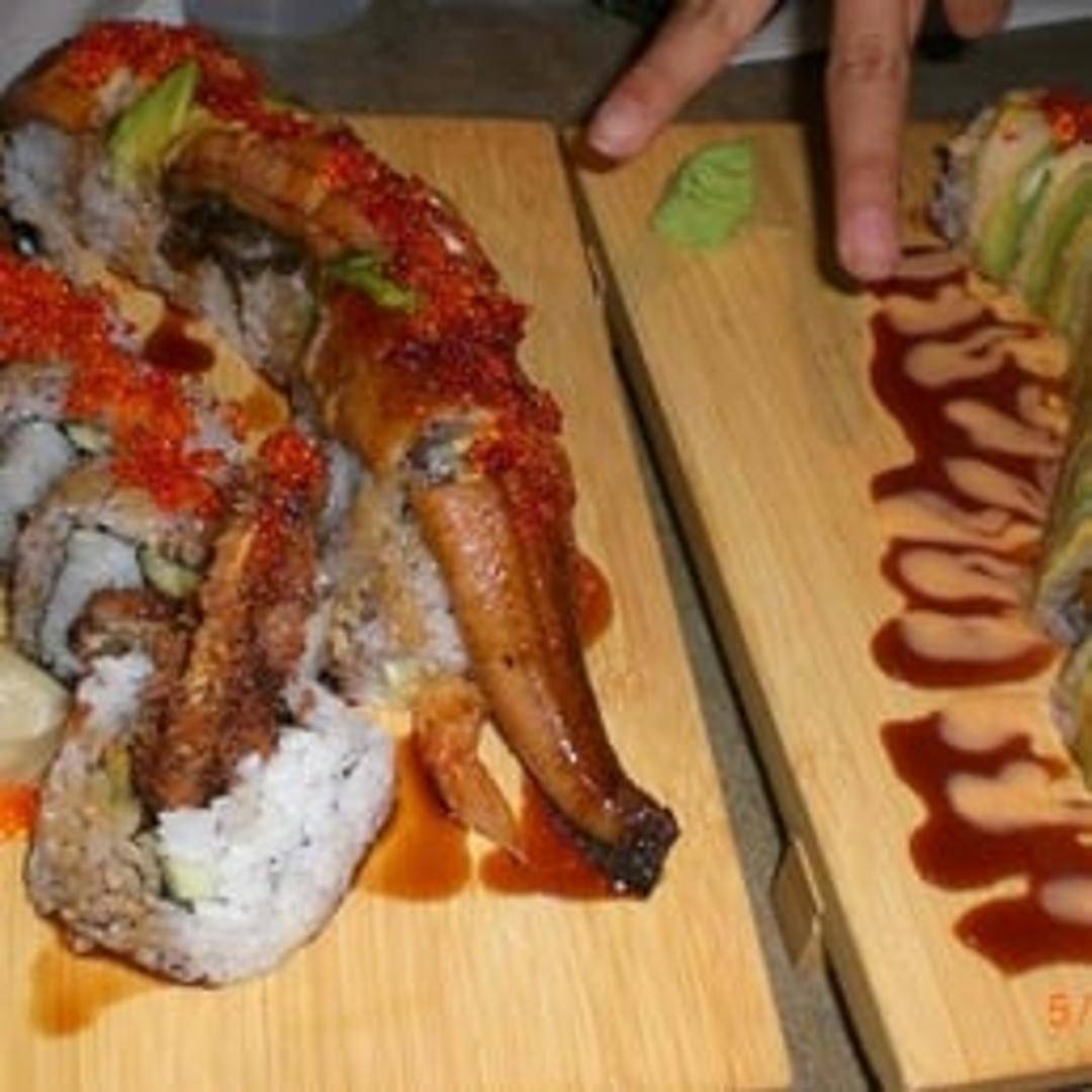 A delectable sushi roll featuring crispy soft-shell crab, cucumber, avocado, sprouts, and spicy mayonnaise, all wrapped in seaweed and rice. Served with eel sauce.