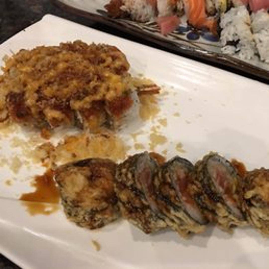 A California roll base topped with baked seafood (typically imitation crab, scallops, and/or shrimp) in a creamy, spicy sauce. Finished with a drizzle of eel sauce and sprinkled with sesame seeds. Sometimes garnished with masago or green onions.
