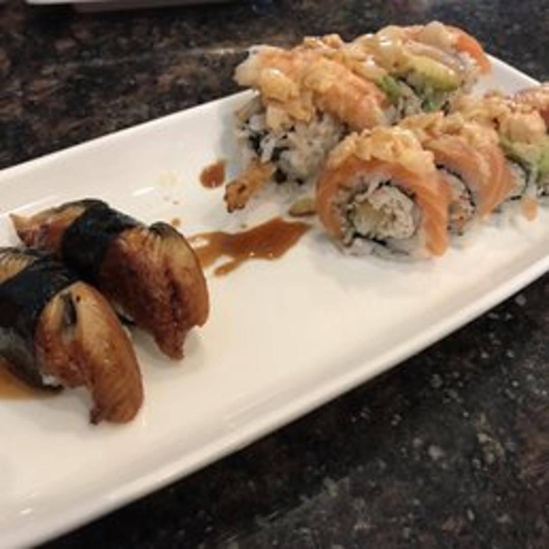 California roll topped with baked scallops, mushrooms, onions, and a special sauce.