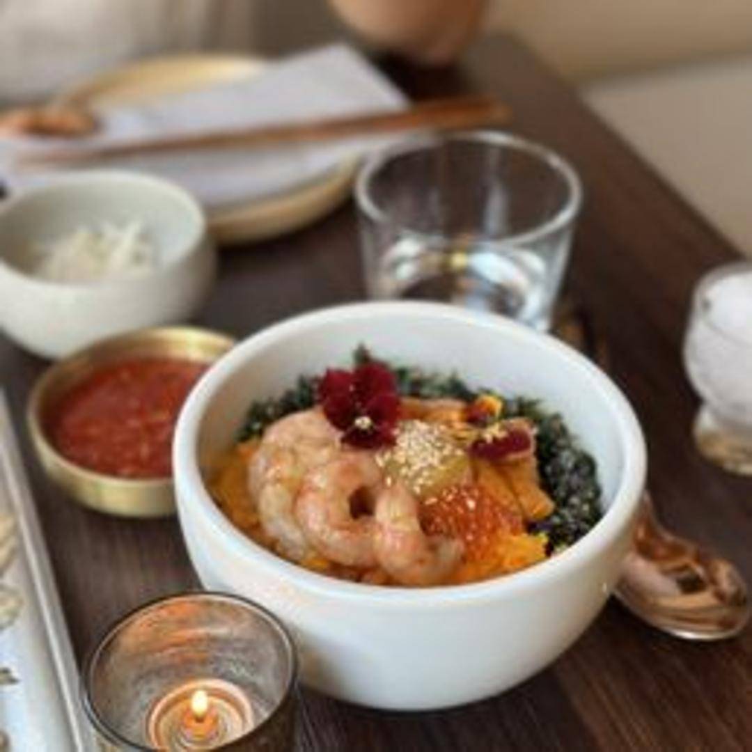 A luxurious bibimbap featuring fresh sea urchin (uni) as the star ingredient. Served over a bed of rice with assorted vegetables, a fried egg, and gochujang (Korean chili paste). A flavorful and visually stunning dish.