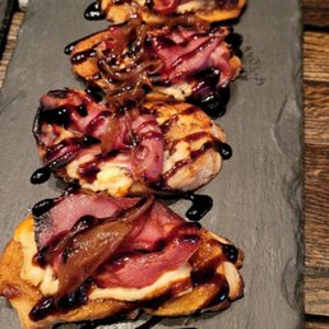 A sophisticated appetizer featuring crisp, toasted crostini generously topped with delicate, thinly sliced prosciutto. This classic combination delivers a delightful balance of salty, savory notes, often complemented by a fresh, balancing element for an exquisite bite.