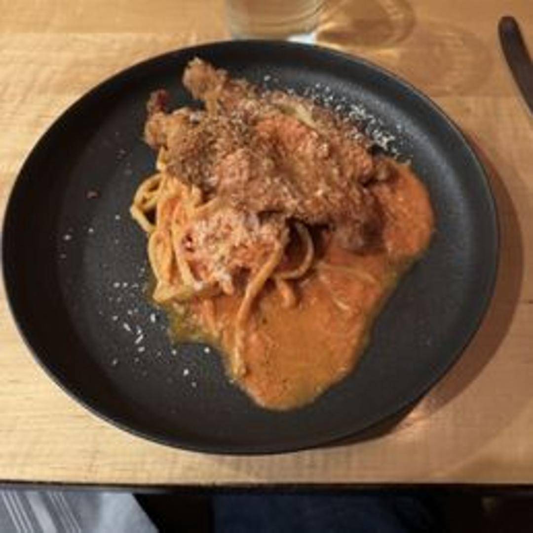 Breaded chicken breast topped with marinara sauce and melted mozzarella cheese, served with a side of pasta.