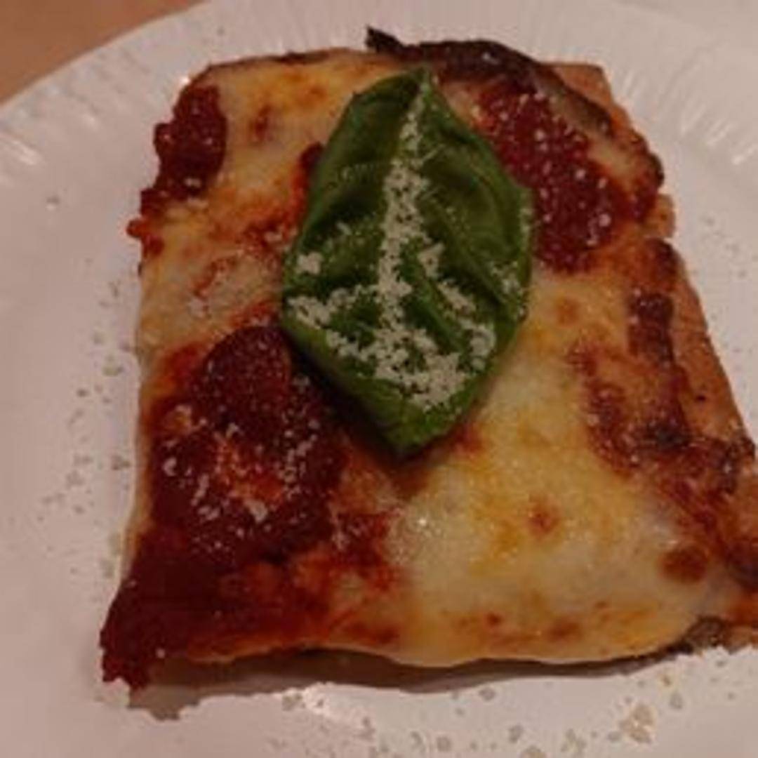 A thick, square-cut slice of pizza with a light and airy crust, topped with a robust tomato sauce, creamy mozzarella, and a sprinkle of herbs. A satisfyingly substantial and flavorful experience.