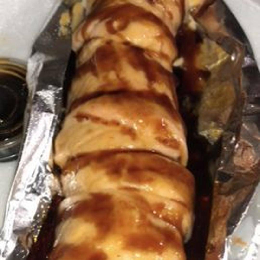 A warm and savory roll featuring baked salmon on top, often with a creamy and flavorful sauce. The interior usually contains ingredients like crab meat, avocado, and cucumber.