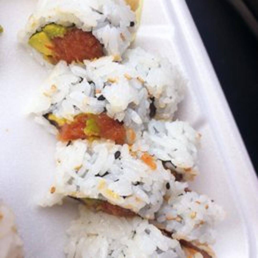 A sushi roll filled with chopped tuna mixed with spicy mayonnaise and other seasonings, wrapped in nori seaweed and rice.