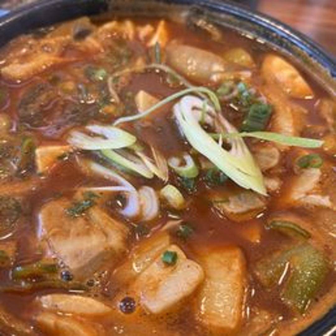 A hearty and flavorful stew featuring tender pork belly simmered in a rich pepper paste broth. Served with soft tofu and a variety of fresh vegetables. A satisfying and complete lunch option.
