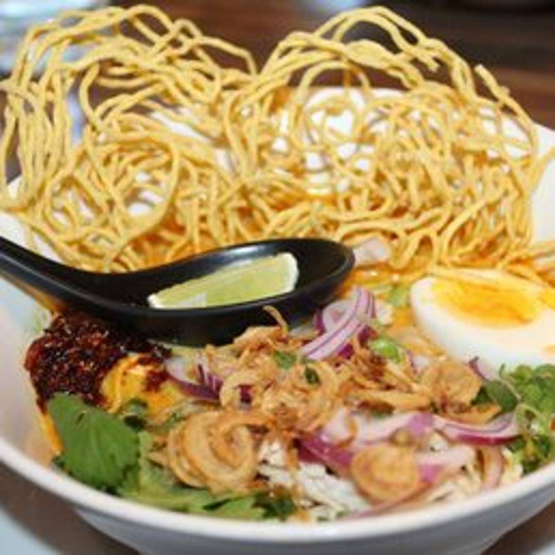 Egg noodles in creamy curry sauce with sliced chicken, red onion, pickled mustard greens, and crispy noodles. A northern Thai comfort food favorite