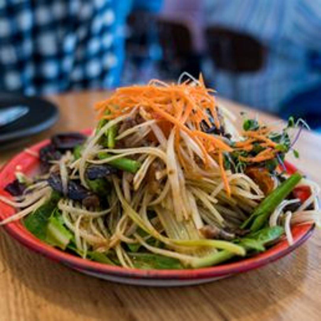 A refreshing and spicy Thai salad made with shredded green papaya, tomatoes, green beans, peanuts, dried shrimp, garlic, and chili peppers. Tossed in a tangy fish sauce dressing with lime juice, palm sugar, and tamarind.