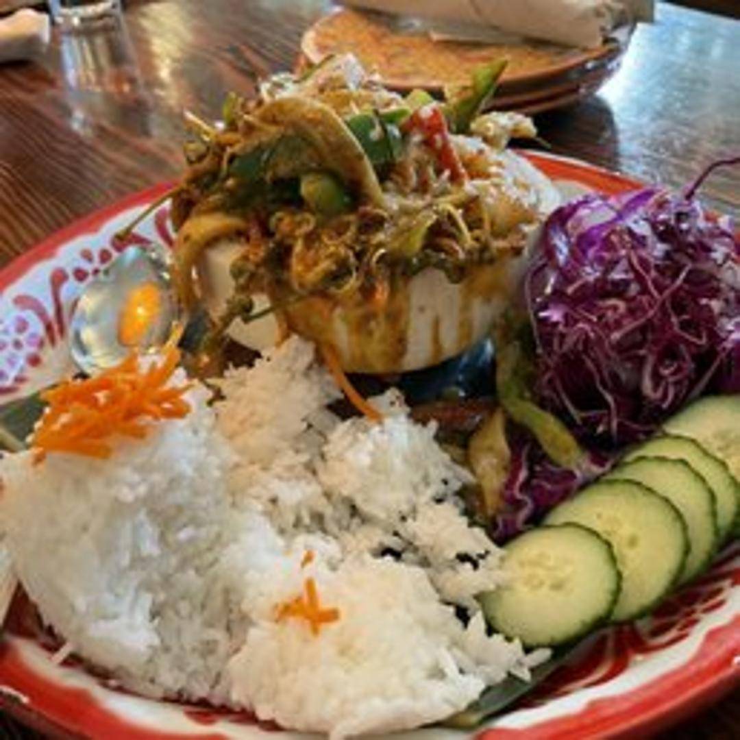 A rich and creamy red curry featuring succulent prawns. Simmered in coconut milk with pineapple, tomatoes, and fragrant spices for a sweet, savory, and slightly spicy flavor profile. Served with jasmine rice.