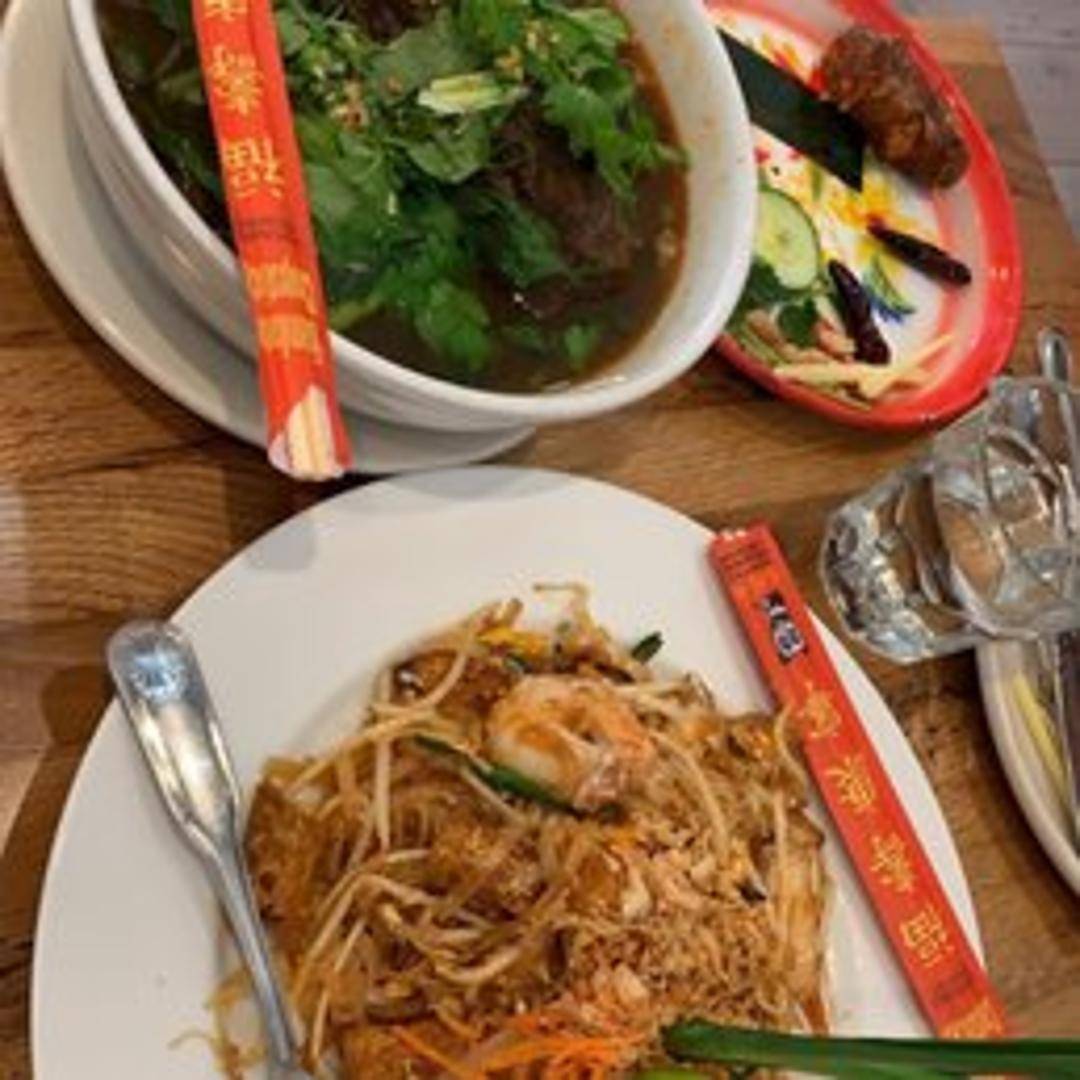 A flavorful beef broth with rice noodles, tender slices of beef, bean sprouts, Chinese broccoli, garlic oil, cilantro, and green onions. Served with a side of chili oil.