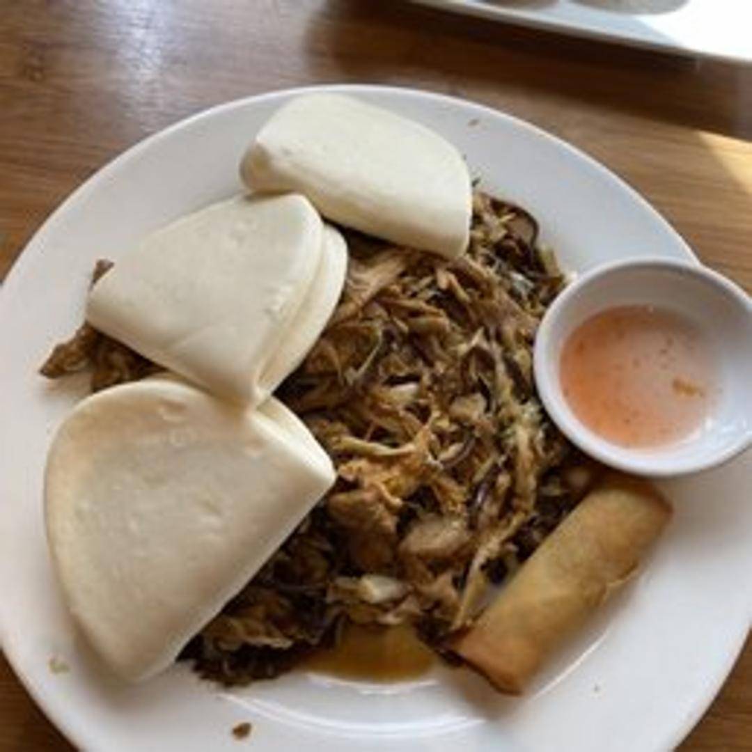 A classic Chinese dish featuring tender shredded pork stir-fried with scrambled eggs, crisp cabbage, wood ear mushrooms, and bamboo shoots in a savory brown sauce. Served with warm, thin pancakes and a rich hoisin sauce for a customizable and interactive dining experience.