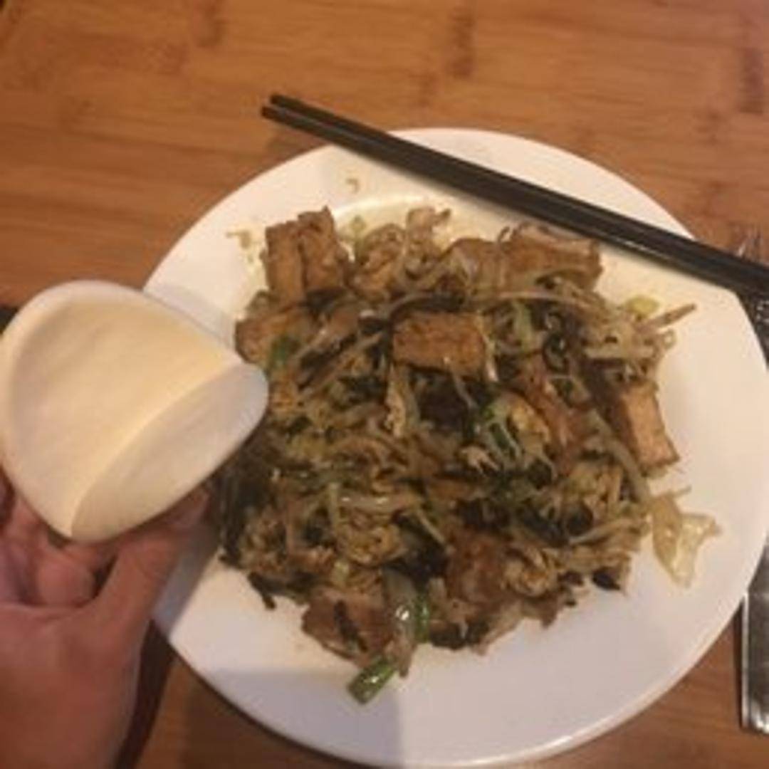 A delightful vegetarian rendition of the traditional Chinese favorite, featuring tender cubes of tofu stir-fried with shredded cabbage, wood ear mushrooms, scrambled egg, and other crisp vegetables in a savory hoisin-based sauce. Served with warm, thin pancakes for wrapping.