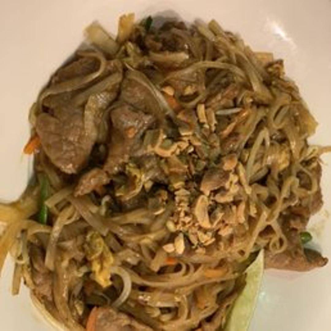 Thailand's iconic stir-fried noodle dish, featuring slippery flat rice noodles wok-tossed with a perfect harmony of sweet, sour, and savory flavors. It typically includes your choice of protein, fresh bean sprouts, crushed peanuts, scrambled egg, and fragrant chives, all coated in a rich tamarind-based sauce. Garnished with a lime wedge and additional crushed peanuts for a fresh, zesty finish.