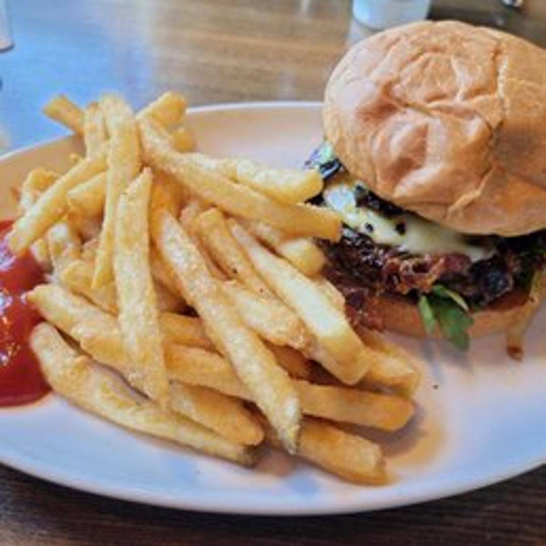 Beef patty topped with bacon marmalade, cheddar cheese, lettuce, tomato, and onion on a toasted bun. Served with fries or salad.