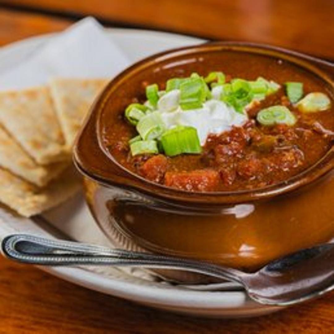 Hearty chili made with ground venison, beans, tomatoes, and a blend of spices. Served with shredded cheddar cheese and sour cream.
