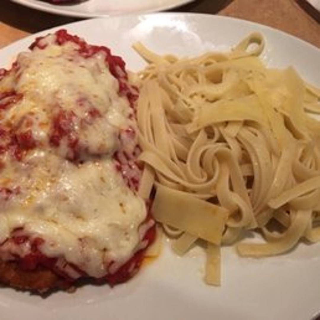 Breaded chicken cutlet topped with marinara sauce and melted mozzarella cheese. Served with a side of pasta.