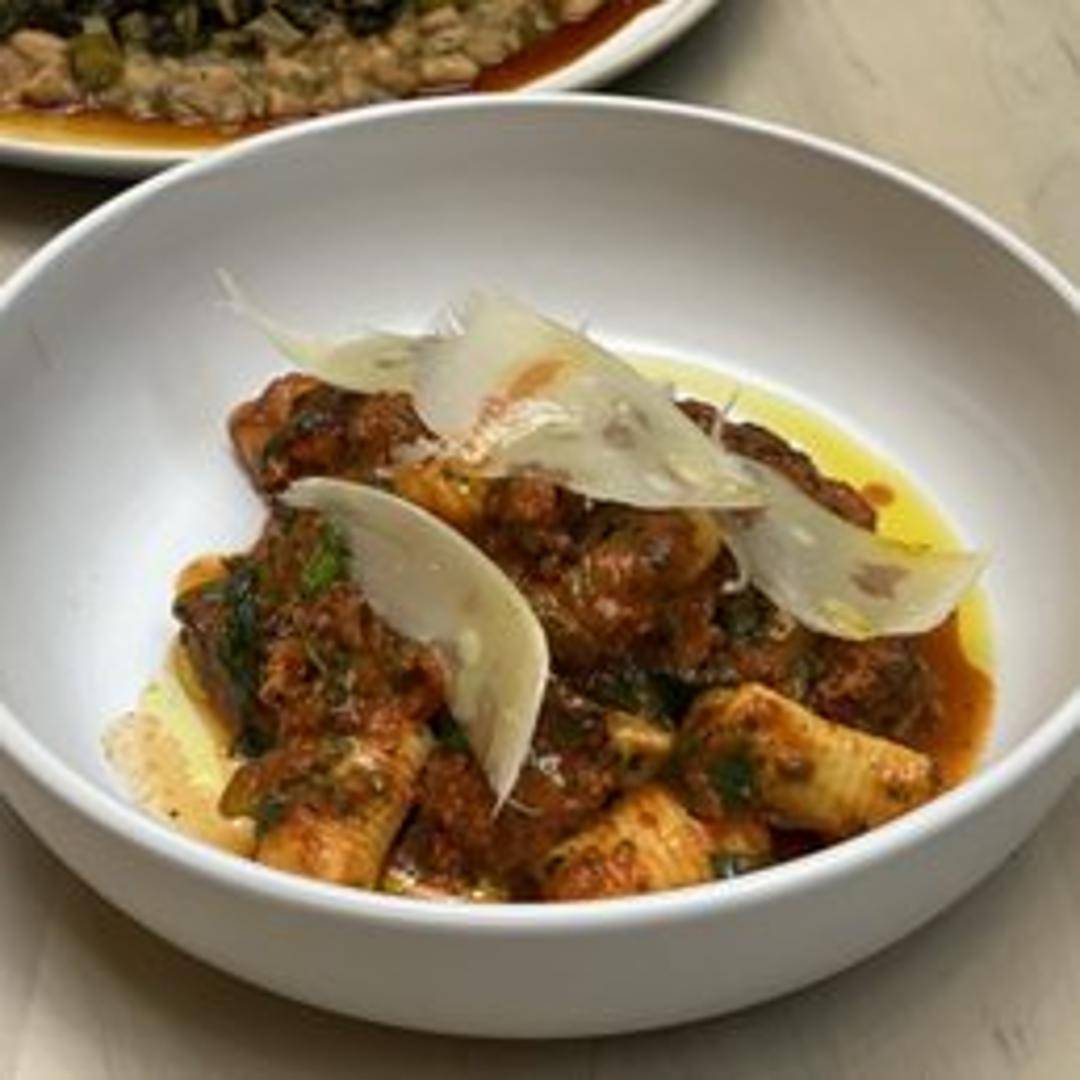 A hearty and deeply flavorful Italian sugo, crafted with slow-braised cuts of tender pork simmered in a rich tomato and herb sauce, perfect for a comforting and satisfying meal.