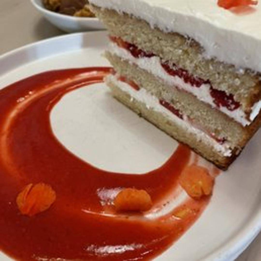 A delightful and refreshing dessert featuring multiple layers of moist, tender cake infused with the natural sweetness and vibrant flavor of fresh strawberries. Typically enrobed in a light, creamy frosting and often garnished with ripe, whole strawberries or strawberry compote for an elegant finish.