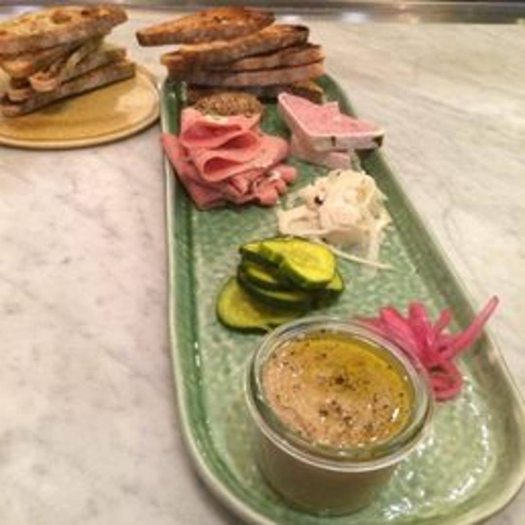 A rich and velvety smooth chicken liver pâté, meticulously prepared to achieve a delicate and luxurious consistency. Served with toasted brioche or artisanal crackers and a sweet-savory accompaniment, perfect for spreading.