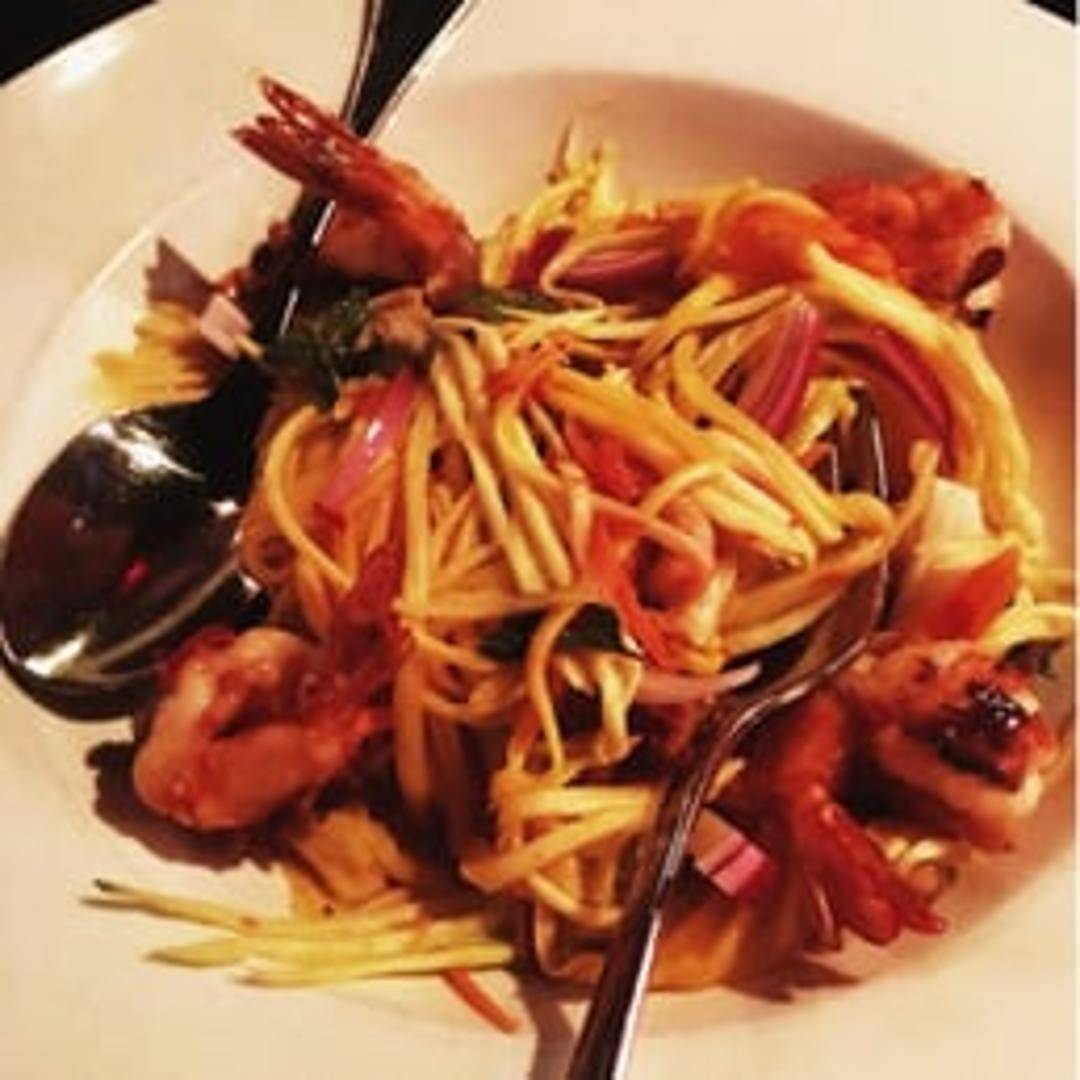 A bright and refreshing salad showcasing the vibrant flavors of green mango. Shredded crisp green mango is tossed with crunchy peanuts, thinly sliced red onions, fresh cilantro, and a hint of chili, all dressed in a zesty and tangy dressing often made with lime juice, fish sauce, and a touch of sweetness. A perfect balance of sweet, sour, and savory notes.