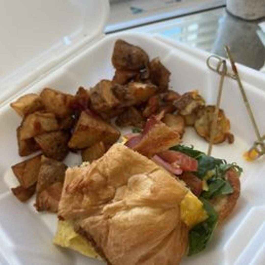 Flaky croissant filled with scrambled eggs, your choice of bacon, sausage, or ham, and melted cheese. Served with a side of breakfast potatoes.