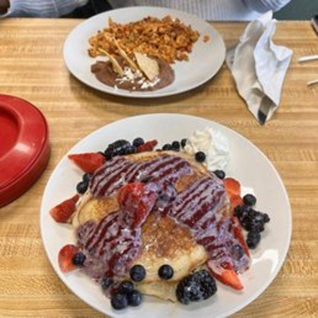 A stack of fluffy pancakes, served with butter and syrup. Choose from plain, blueberry, chocolate chip, or banana.