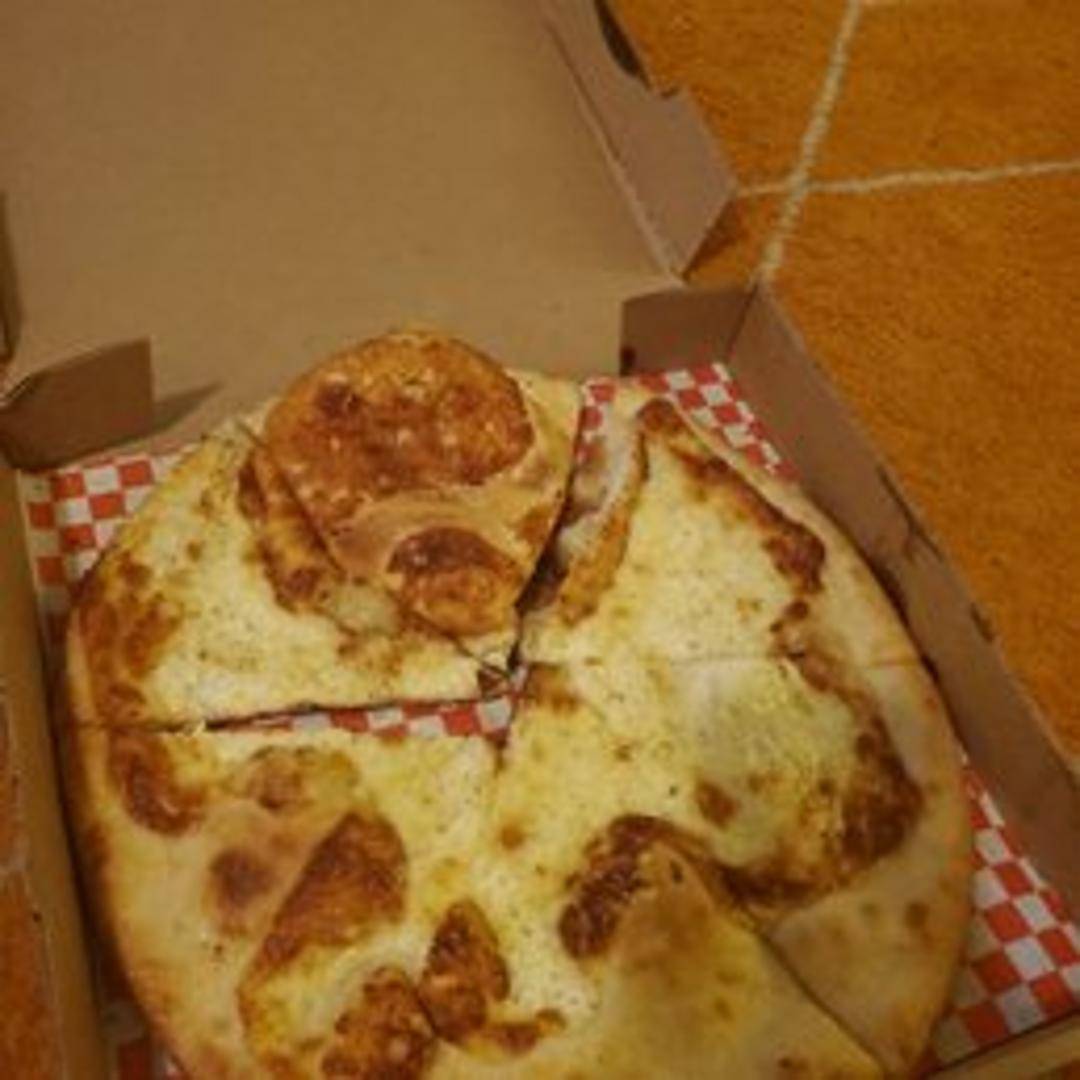 A creamy and flavorful white pizza featuring a blend of ricotta, parmesan, and mozzarella cheeses, seasoned with garlic, herbs, and a drizzle of olive oil on a crispy crust. No tomato sauce.
