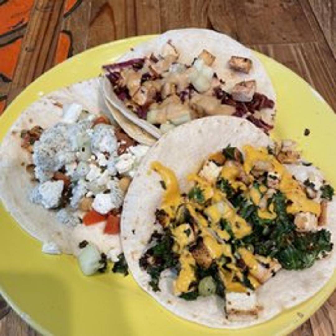 A Mediterranean-inspired taco filled with seasoned ground lamb or beef (or vegetarian option), crumbled feta cheese, diced tomatoes, cucumbers, red onion, and a creamy tzatziki sauce.